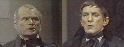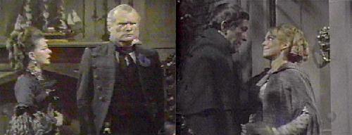 Collinwood drawing room - When Barnabas tells Joshua he and Angelique are going to get married tonight, Joshua becomes absolutely infuriated--this decision is disgusting; HE is to decide when the time is right for the marriage, not Barnabas! Barnabas' mind is made up; he's marrying the girl tonight. Joshua is equally adamant, and he's angry Barnabas is going back on his word to wait a suitable mourning period. Barnabas is sure his father is just trying to buy time and undermine the wedding--he knows of his father's attempts to buy off Angelique, and Joshua is forced to admit she turned down the 10 grand in gold he offered. He did it for his son's own good, argues Joshua, he was testing Angelique.  It almost pains Joshua to admit that the prospective bride turned down his offer--she wants Barnabas, not his money. Barnabas thinks this must have astounded his father (which is really sad, apparently Barnabas thinks his father doesn't consider him worthy of being loved). Barnabas vows to go ahead with the wedding tonight without his father's blessing, but Joshua warns him that if he does that, he will forfeit his inheritance--no money, no property, no part in the family business, and no portion of the will. Barnabas can hardly believe his father would disown him, to not even allow him to lead his own life, but as far as Joshua is concerned, if Barnabas marries Angelique tonight, he isn't capable of running his own life! As if that isn't harsh enough, Joshua orders Barnabas and Angelique out of the house by nightfall. "I am no longer your father, and you are no longer my son," Joshua says coldly. As Barnabas heads upstairs, Joshua looks as if he is about to collapse from misery.