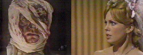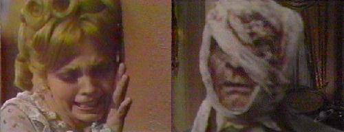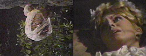 She finds herself locked in the room after they go, and Jeremiah appears. He's going to punish her for disturbing his rest, and teach her what it's like to live in the land of the dead! Jeremiah advances on her. As Barnabas and the minister wait downstairs, wondering what's keeping her (and Barn probably fearing he's been stood up for the second time in just a few weeks), a laughing Jeremiah carries Angelique to his grave, drops her in, and begins dumping dirt on her and her clean white gown. Terrified, she stares up at him, shrilly screaming, "NOOOOO!" as he continues to bury her in his grave.