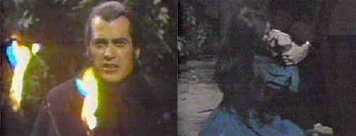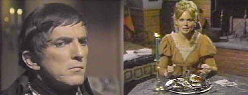 Barnabas, puzzled at seeing his bride using candlelight during the day, asks Angelique why she lit them as she snuffs out her spell-binding candles. Oh, she was crawling around on her hands and knees in a most unladylike posture, searching for the brooch Naomi gave her--so she had to light the candles to find it. It was a gift from the mother of her loving husband, she says softly, caressing his face, but then Sarah, calling, "Miss Winters!" walks into the Old House followed closely behind by Joshua and Abigail. Angelique does her best to play hostess, but she is ignored, and Joshua glares at Barnabas as he asks permission to come into his house. (Poor guy is just trying to show his father that he's an adult, a bridegroom, but Joshua just won't bend.) Abigail demands that Sarah explain how she heard her governess' disembodied voice, but Barnabas calls the whole situation absurd and insists Vicki isn't there. Abigail asks his permission to search the house, anyway. No, says, Barnabas, Miss Winters is a poor, frightened, hunted girl (and he flat out says he wouldn't tell them she was there even if she was). Abigail warns Barnabas that all of them are in danger from the witch, but especially Sarah, who Miss Winters called to.