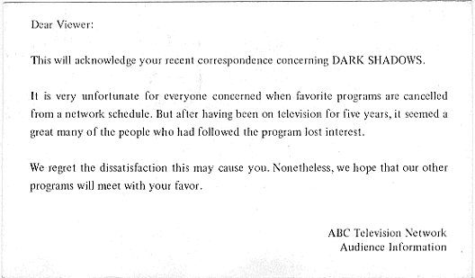 Even though I knew it was coming, in the couple weeks before that hideous day I kept hoping that it wasn't true, that ABC had changed its mind, that on April 5 it would still be there, picking up where it had left off before the PT1841 storyline, with Barnabas, Julia and Eliot accompanying Elizabeth to hear Roger's speech.