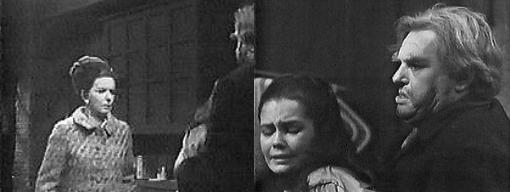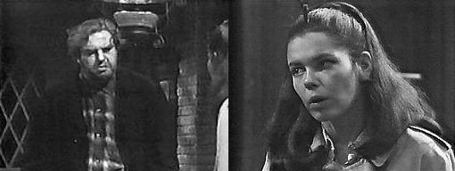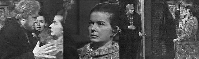 Think about it, Vicki tells Matthew--think what'll happen if you kill me--the sheriff will find out, come after you, and he'll capture you and you'll have to stand trial for murder. No, he says, it won't happen that way. But it will, she says--the sheriff isn't stupid, he'll know how it happened. He didn't connect me with Malloy, says Matthew. That was an accidental death, completely different, says Vicki, this is premeditated murder--so he'll be questioning, and sooner or later, they'll question you. Why me? he asks. Because they'll find out I didn't leave Collinwood--Mrs. Stoddard will tell them--they'll know I must be somewhere here on the grounds--there are only four people here--Mrs. Stodddard, Mrs. Johnson, David, and you--she points at him--(not wise, Vicki; your concept is cunning, but this man has blinders on)--and sooner or later, they're going to come up with the right answer. They'll think you just went away, he says. Without telling anyone? she asks, creeping backward toward the door--without taking anything--who's going to believe that? You're trying to scare me, confuse me, he says, blocking her way, it's not gonna do you any good. It's not going to do you any good if you kill me, she says, you know that. I have to keep you quiet, he says, advancing toward her, I wish I didn't have to kill ya, I wished you hadn't forced me into it. Forced you into it? asks Vicki, incredulous. You wouldn't stop your meddlin', he says, I tried to stop ya, to scare ya off--that first time was the time I come to your room. So it was you, she says, backing away--what were you planning to do? Scare ya enough so you'd stop your pryin' he says--you'd stay out of things that didn't concern ya, but you wouldn't--too bad you didn't. And last night on the road, she says, it was you that tried to run me down, wasn't it? Matthew admits it. Did you want to kill me then? she asks. I could have run over you then if I wanted to, he says. But you didn't want to! she tells him. Not at the last minute, he says, I guess I had some foolish notion I'd scared ya enough to stop your snoopin' and get you out of Collinwood--I might have known you'd go straight to the sheriff. And tonight, when you dropped that urn, she says. What about it? he asks. Were you trying to kill me then? she asks. I'm not sure, he says--I thought it might hit ya. But it didn't, she says, you didn't want it to hit me. Maybe not, he says. You don't want a murder on your conscience! She says. I wouldn't kill anything unless I was forced into it! he says, pushing her down in one of the kitchen chairs--you forced me into it! You don't want to kill me, says Vicki. Stop talking! he rails at her. What are you going to do? she asks. I'm not sure, he says, dipping his head down, I have to think!--he looks at her pale, scared face.