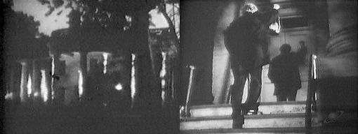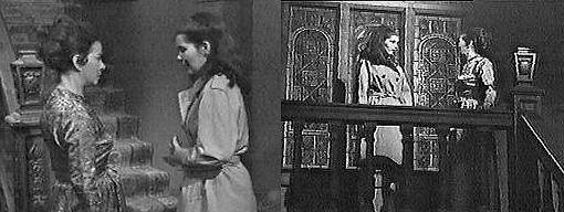 Foyer of Collinwood - Frank asks Patterson where his men are now. Half of them are combing the beach, says Patterson, the other half are looking in the woods. There are some caves that Mrs. Stoddard...begins Frank, but he stops when Liz and Vicki come in and the latter runs into his arms, calling his name. Where have you been, what happened? demands Frank. Matthew, he tried to kill me! says Vicki. The caretaker? asks Patterson.