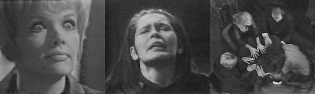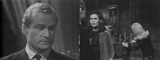 Mrs. Johnson watches as Vicki and Carolyn set up chairs around a table in the drawing room. You certainly picked a perfect night for it, she remarks, then leaves the room. Dr. Guthrie should be here any minute, Vicki tells Carolyn. I don't know how I allowed myself to become involved in this, says Vicki. I've been asking myself the same question, says Vicki, do you think we should call it all off?--I have a strange feeling bout, I just think it's something we shouldn't be doing--don't you think we should take a minute to make sure we want to go through with it? Please don't start talking like that, says Carolyn--if we start talking like that, we may never know what's wrong with my mother. I know that we must have a seance, says Vicki, but...all the time I keep getting this awful feeling that something's going to happen to me! She stands by the window silhouetted in lightning, fear on her face.