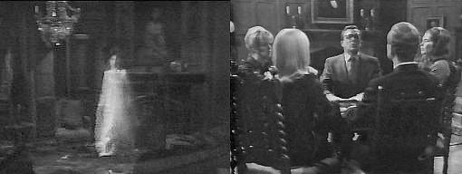 Vicki lights the candles. We must keep in mind that experience may be a very gratifying one, he says, we may be able to understand the reason for Mrs. Stoddard's trance. Carolyn enters and greets Peter. My uncle will be along in a moment, she says, I must warn you, his attitude is not the best. Mr. Collins' attitude doesn't bother me in the least, he assures her. Good luck to all of us, she says, on this occasion. I hear someone toasting, quips Roger, but I don't see anyone drinking--good evening, Doctor. Peter greets Roger and says if they're all ready, they can begin. I'm as ready as I'll ever be, says Carolyn. Vicki says she is, too, continuing to light the candles. Let's get it over with, agrees Roger. If you'll all sit at the table, I'll turn out the light, says Guthrie. He closes the double doors and turns out all the lights, then turns on the recorder. How very restful, remarks Roger. Make yourselves as comfortable as possible, advises Guthrie. He sits across from Roger. Vicki and Carolyn face each other. Our object here tonight, says Peter, is to summon the ghost of Josette Collins--now we're all reasonably certain that she's been trying to communicate with us (Vicki looks nervous)--now we feel if we can create the proper atmosphere and right state of mind, that she will come into this room and speak to us--she might either appear to one of us or use one of us as a medium, to speak through. Well I certainly hope she uses you, doctor, it will be something to remember, hearing her voice coming out of your mouth. (LOL!) Mr. Collins, says Peter sternly, if you want to make a joke of this, I'd be very grateful if you'd leave the room now. I'm sorry, says Roger, please proceed. Thank you, says Peter--now, let's place our hands flat on the table. (We get an overhead view.) Spread your fingers and make a circle of the fingers by touching the fingers of those next to you. We must keep this circle unbroken at all times...that's good--now the electricity of thought has been set in motion so that if will flow through us, making our minds as one--let us begin to concentrate--we must repeat over and over in our minds, "Josette Collins...Josette Collins...Josette Collins..." Thunder rolls. Everyone concentrates. Josette...Josette, I'm calling you, says Peter. Vicki's face changes. Josette? asks Peter, come to us, Josette. Vicki begins to moan. Vicki, says Carolyn. Leave her alone, hisses Peter, contact is being made--concentrate on Josette. They all watch Vicki. Come to us, Josette, says Peter. Ohhhhh, says Vicki, ohhhhh! There's a presence here, says Peter, a definite influence. Carolyn looks terrified as Vicki continues to moan, louder and louder. It seems to be getting closer, closer, says Peter. The doors blow open. Carolyn screams. A hooded figure stands there.