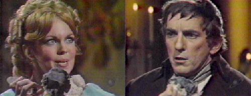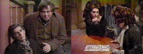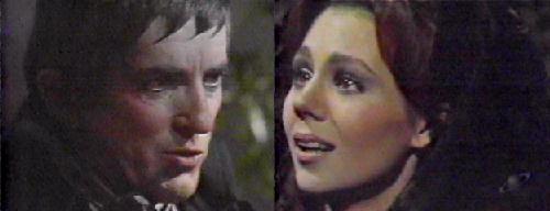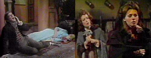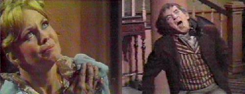 Ang, livid, returns with Sarah's doll and the hat pins. She can keep him there, all right! she snarls, and begins stabbing pins into Sarah's doll. I can put one right into the doll's heart, killing yout sister! She cries.  Barnabas, turning pale, begs her to remove the pins; he'll do whatever she wants! Sarah will come very close to death is he deceives her again! screams Angelique. Barnabas slowly backs away, then turns, grabs one of the pistols from the box, and fires at his wife.  "Oh, Barnabas, what have you done?" she moans, holding her hand pressed to her bloody shoulder. She drops the doll.  He immediately retrieves it and removes the pins.  And then, Angelique says, with bitterness and fury, "You didn't do the job well enough, Barnabas. . .I am not dead yet, and while I can still breathe, I'll have my revenge. I set a curse on you, Barnabas Collins!  You wanted your Josette so much, well, you will have her, but not in the way you would have chosen. You will never rest, Barnabas, and you will never be able to love anyone, for whoever loves you will die! That is my curse, and you will live with it for all eternity!"