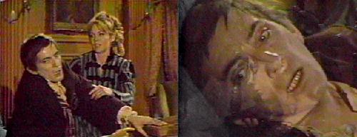 At the Old House, Ben peers through the window and sees the horrific sight of Angelique lying in a pool of blood and Barnabas lying unconscious against the pillar. He wonders--did Barnabas kill his wife?  Did she kill him, too? He sees the oozing marks on Barnabas' throat and decides he'd better help him upstairs and get a doctor. He can't risk letting Joshua see him.