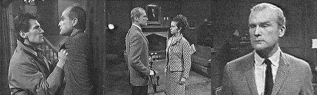 Liz paces the drawing room while Carolyn looks through a magazine on the piano. Outside, Roger's car pulls up in front of the house; he gets out and enters. He closes the doors and removes his hat. When Liz meets him at the door, he jokes that he didn't expect a welcoming committee this time of night. He takes off his coat. Have you seen Vicki anyplace? Liz asks him. Oh, I've see that girl in many places, he says. Tonight? asks Liz anxiously. I'm merely generalizing, my dear, he says. She's vanished, I thought you might have some idea where she'd be, says Liz. Not in the slightest, says Roger, dropping his coat over Vicki's suitcase, and it doesn't interest me one bit. Oh, Roger, says Liz, following him into the drawing room--how can you be so indifferent? He pours a drink. My dear sister, he says, I have a compulsion to preserve my way of life, and that little girl does nothing but interfere with it. But this may be serious! protests Liz. Everything is serious with that girl, says Roger, annoyed. He drinks. They've searched everywhere for her! says Liz. What do you want from me, asks Roger, do you want me to go our into the cold of night and beat the bushes? (Yes, you lazy SOB, that would be nice.) I expect you to show some concern for a girl who may be in danger, says Liz. Perhaps you expect too much from me, suggests Roger. I expect you to have some compassion, she says. I reserve that only for those who deserve it, says Roger--such as you, my dear, he tells Carolyn, still reading the magazine. What an honor, she says. Although I don't know if I should even be talking to you, he says, considering the way you defy me--I suppose I'm foolish to deliver an ultimatum to a creature as wild as you are. Yes, giggles Carolyn, very foolish, since it only heightens my desire to defy you further--I spent a wonderful and memorable evening with none other than Burke Devlin. Roger glances at Liz, then back at Carolyn. Well, that doesn't speak very much for you, he says--it indicates a major shortcoming in your sense of judgment. Which proves me to be a Collins, she shoots back. Roger puts down his drink. Listen, he says, I'm going to try to appeal to your sense of intelligence, to make you understand what Devlin represents. What he represents to you is not what he represents to me, she insists. Oh, and what might that be? he asks. Fulfillment, she replies. Exactly, says Roger--fulfillment for him, but not for you--and fulfillment for him means the destruction of everything the name of Collins stands for! So my mother just told me, says Carolyn, and they both look at Liz, sitting on the sofa. I know you're fascinated by Devlin, says Roger, he's different, but that will wear off very shortly, there are many like him!--he's really quite common. Carolyn, her arms crossed over her chest,, says, "He's hardly that." She gazes into the fireplace. By common, says Roger, I mean he's predictable--you always know what he's thinking, and what his next move is going to be. If you know him so well, says Carolyn, he should be absolutely no problem for you. He's an annoyance, says Roger, and a temporary one at that--my dear, if only you knew that he's using you--you can't see it now, but you will sooner or later--and it may be too late--it will be a terrible experience for you--and it will be just as terrible for us to stand by and watch it. Have you ever considered you might be completely wrong? asks Carolyn, walking away from him. I don't have to, he says, he told me that I'm right, by letting me know his tactics--if you continue to see him, which I hope you won't, you will get to know his methods. What methods? she asks. Simply the choosing up of sides, says Roger--he will draw a line and stand on one side, that will be "for Devlin." What's the other side called? asks Carolyn. Everything and everybody--Burke Devlin against the world! says Roger. That sounds like even odds to me, says Carolyn, returning to the magazine. And then, my dear, he will tell you where to stand, warns Roger. I'll know where to stand, says Carolyn. Oh? he asks Roger--and where will that be? Wherever I choose, she says. You may have no choice, he says, if Devlin should win, your usefulness may be ended. It would be quite a surprise to you if Burke were not using me, she says. It would indeed, he says, I would have to reevaluate my whole scheme of ideas. He goes to Liz and makes a gesture that says, "I tried--your turn." Did Burke tell you about his new business venture? asks Liz. He does not discuss business with me, Carolyn says. Then you don't know that he's taken over Logans Enterprises? asks Liz. Did he really? asks Carolyn. Yes, today, Liz informs her--and he celebrate with you tonight. Logansport Enterprises, says Carolyn, a note of uncertainty in her voice--well, you've got to say this for him--he certainly does things in a grand manner. No, says Liz, that is not the grand manner--what Burke did was purely underhanded, destruction his goal. And that is pure hypocrisy, accuses Carolyn--with all you've said about him, you were still glad to see him tonight! You saw him tonight? Roger asks his sister. He came here to search for Vicki, says Liz. And you hate him so much, that you made coffee for him when he returns, says Carolyn. Burke Devlin coming into this house tonight? asks Roger, giving Liz a look of fury