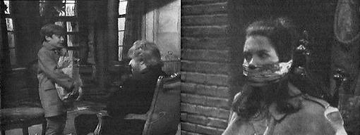 Matthew takes the gag from Vicki's mouth and holds it around her neck, warning her that one scream, and this will fit pretty good around your throat. I promise, she says. Like all the others? he asks. No!, she says. We'll see, he says--I don't want to hear ya beggin' me for mercy, askin' me to let you go--it won't do ya any good, and it will make me mad. I won't, she says. All I want from you is to shut up and leave me alone, don't bother me--you're makin' things tough, he says. I can't help you, she assures him. I don't need your help, he says, I've got everything all figured out--for me--what'll happen to you is something else. It isn't my fault that all of these things have happened, she argues. It is! he says, everythin' was all right until you came here, months ago, when you came to Collinwood, started askin' questions, prying, snooping, botherin' everybody. You act as if I'm responsible for everything that happened! says Vicki, well those things would have happened even if I hadn't come here! That's not so, he says, pacing--too late now, we made our mistakes, you and me, only the difference is, I'm going to get away with mine, because what I did, I did for a good reason, for other people, the Collins family, I didn't do it for myself! I'll explain to everybody, she says. They wouldn't understand, he insists. I'll make them understand, she tells him. No one can help me, he says. I CAN! she says. They want to punish somebody and I'm not gonna let 'em punish me! he says--they'll never get a chance to, because they'll never find me! They'll come back here and search the way they did last night, she warns him. They can tear this place apart, stone by stone, board by board and they'll never find me! he says, I'm a lot smarter than people think I am--I'll be outta here before long--all I have to do is hole up for a little, be patient, I got a long life ahead of me! How long can you stay here? she asks--what are you going to do about food and water? He smiles. How long can I stay here?--food, water--I've got those little details all figured out, he brags--I got the best food and better water--maybe you're a little hungry, huh?--he grabs her hair and pulls it--breakfast is on its way if you behave yourself, I might let you have a little--and he lets go of her hair.