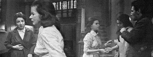 Collinwood - Liz rushes downstairs and dials the phone, her face frantic. She calls Patterson, telling him to get up to the house immediately--it's an emergency--David just told me the most amazing story--Matthew's on the property and he has Vicki at the Old House. Mrs. Johnson exits the kitchen and overhears. Apparently, Liz tells Patterson, there's a room there no one knew anything about and that's where he's been hiding--my brother and Burke Devlin went there, but haven't come back yet, and I'm terrified!--can you get up here right away and bring some men with you?--thank you, George. She hangs up. Did I hear right? asks Sarah--I'm sorry, I heard voices, and I was worried, so I came down, I couldn't help but hear you--is that true, that Matthew's somewhere here and he's got a hold of Vicki? That's what David said, Liz tells her. How would David know? asks Sarah. It's a long story, says Liz. If it's true Matthew's got her, we won't see her again outside of a graveyard, predicts Sarah. Liz shakes her head and asks her to please not talk that way--I'm frightened enough as it is. So am I, says Sarah, all night evening long, I've had this strange feeling, a chill in my bones--there's only one other time I had this feeling--the night Mr. Malloy was killed. Liz does not appreciate this revelation.