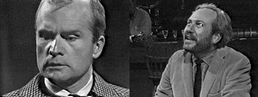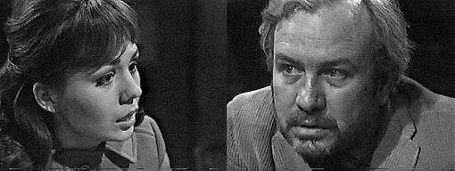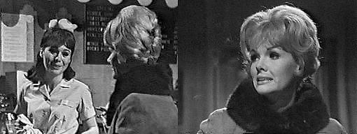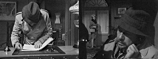 He goes into the phone booth and is just about to dial when the blonde herself walks in. He huddles in the booth as if trying to hide, the phone held to his ear. She goes upstairs. Sam dials Collinwood. Roger answers, and, learning it's Sam, asks what he wants. You--at the Blue Whale, orders Sam--in two seconds flat. You're drunk, accuses Roger. Yeah, agrees Sam, and I'm gonna be drunker. What's the matter with you? asks Roger. The worst possible thing that could have happened HAS happened, Sam tells him, and hangs up. Roger looks at the dead phone and hangs up, too, then grabs his coat and hat from the bench in the foyer and leaves the house.