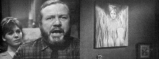 Roger pours himself a drink. Whatever Burke feels about Laura is no concern of mine, he tells Carolyn, because I know both of them so well. I'm with you, she says, I'd like to see Burke get the short end for a change. You will, my dear, he says, have no fear--I assure you. Vicki enters. Did you find David? Roger asks her. Yes, says Vicki, he went shopping in town with Mrs. Johnson. How did you ever get him to go with her? asks Roger sourly. It took a lot of persuading and is going to cost you a set of toy soldiers, says Vicki. It was worth it to get him out of the house, says Roger, he's had a fixation for that hideous painting, keeps staring at it by the hour. Can't you get it away from him? asks Carolyn, now seated on the sofa. Roger sits beside her. I tried to, he says, but he caught me at it, made all the threats that his crafty little mind could muster. He's not here now, says Carolyn--why don't you get rid of it now, while you have the opportunity? That would be a terrible thing to do! says Vicki--it would take him a long time to get over that!--I've wanted to get rid of it myself--don't think I don't feel guilty because it was me that brought it here. Why did you bring it here? asks Carolyn. I don't know, says Vicki--I didn't like that painting--but when I saw that Mr. Evans was going to take it off the easel and throw it out, something made me want it. I know, you're the type who can't stand to see anything thrown away, says Carolyn. That's not it at all, says Vicki--I don't know, I had to have it. None of us is perfect, my dear, soothes Roger. Vicki volunteers to answer the knock at the door. It's probably Mrs. Johnson, remarks Roger, she's the type to forget her key. It's Sam. This is a surprise, Vicki says--come in. Sam tells her he wants to see Roger. He's inside, says Vicki--I heard about your accident... Yeah, the accident, says Sam. Vicki takes his coat and asks if his hands are all right. They're still attached to my arms, that's about all they're good for, he says--do you still have the painting? It's still hanging in David's room, says Vicki. Why didn't you let me get rid of it? asks Sam. I don't know, admits Vicki, I wish now I'd had, I'm beginning to regret it. I've got to talk to Roger, says Sam. He's right in here, says Vicki, leading Sam in. Mr. Evans would like to talk to you, she says. Hello, Evans, says Roger, rising to his feet. Sorry I'm intruding, says Sam, I'll only be a minute. That's good, says Roger--can I offer you a drink, or are you unable to hold a glass? No thanks, says Sam (hey, this just might force him on the wagon, so it's a somewhat good thing), some other time, if you don't mind--I came about the painting, I wonder if I could see it. What on earth for? asks Roger. I don't know, says Sam, I just have this feeling that I've got to see it. Do you make a habit of visiting places where your paintings are hung? asks Roger. No, seriously, says Sam, it's important that I see the painting--I'm sure you can do that for me. Roger looks unhappy. I suppose so, he says--I suppose while David isn't here, we could borrow it for a minute--Vicki, would you go up and bring the masterpiece down so the artist can gaze upon it? Certainly, says Vicki, leaving the room. Thanks, says Sam, I appreciate that. Is it your ego that makes you want to see this picture? asks Roger, perplexed--you're sober now, and even more difficult to understand. Not ego, says Sam, something that made me want to see it, I don't know what, but I hope to find out.