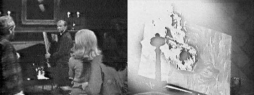 NOTES: Sam senses not only that the painting is completing itself, but that it will soon burn, too. How does he know these things? Is he channeling the spirit world? Did Josette herself complete the painting, now that Sam is unable to, and he is the one chosen to bring everyone's attention to the finished product? Laura herself clearly has nothing to do with the painting, in fact, loathes it, but Vicki brought it back to Collinwood, inexplicably, despite her feelings about the painting. Is she, like Sam, also being used by the spirit world to warn them, to prove that David needs protection from his mother?