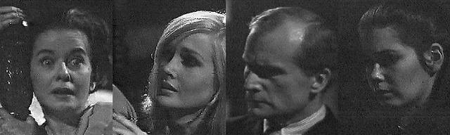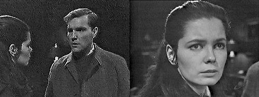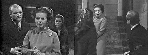 Vicki comes downstairs at Collinwood, still wearing the same clothes as the night before. She puts her coat on the foyer table. Hearing a car pulling up outside, she runs to the window to see who it is, then goes to the door. It's Frank. Come on in, she says. I'll get my coat, she says. Where are we going, what's happening? he asks. I'll explain it later, on the way, she says. Where? he asks--you call me at five o'clock in the morning, you say you'll explain it when I get here, now I'm here, you say you'll explain it on the way, and when I ask you where... I just don't want to waste time! says Vicki. What's going on down there? asks Roger, appearing on the landing. Vicki asks how Liz is. She's still sleeping, thank goodness, says Roger, Carolyn's with her--Gardner, what are you doing here at this hour? I wish I knew, says Frank, something wrong with Mrs. Stoddard? Hasn't Vicki told you? asks Roger. Not yet, says Vicki. What happened? asks Frank. I'll explain it to you later, says Vicki. Where are you two going? asks Roger. I'm sorry, says Vicki, but after this night it was so difficult, and I saw I couldn't get any sleep. That's certain enough, says Roger. So I asked Frank to take me for a drive, says Vicki. A drive to where? asks Roger, perplexed. No where in particular, she says, just out of the house to relax--I won't be gone long, I promise. I want to know what happened to Mrs. Stoddard, says Frank. It's another one of those terrible, unexplainable things, says Roger--it happened last night. she fainted right there at the foot of the stairs, says Vicki. Then she is sick, says Frank. That's what we thought, says Roger, but then she seemed to recover almost immediately. But when she came round, says Vicki, she couldn't remember anything that happened to her just prior to her fainting. And when she seemed to try to recall it, she got terribly weak all of a sudden, says Roger. The doctor examined he and couldn't find anything wrong with her, adds Vicki, except for the weakness and lapses of memory. He ruled out the obvious, says Roger, it wasn't a stroke--then he made some more tests and left, saying all she needed was rest. And she's resting now, says Frank. Wait, that isn't all that happened, says Vicki. Roger gives her a look. You realize, Gardner, I'll expect you to maintain a professional silence about this, says Roger--Mrs. Stoddard is ill--that's all anyone in Collinsport has to know. Of course, says Frank. In the middle of the night, we hard her cry out, says Roger. We should never have left her room, says Vicki. We heard her say, I remember--now I know. Presumably she knew what happened to her, says Vicki. We rushed into the room...he can't get out the words.