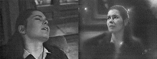 Laura Murdoch Radcliffe, says the caretaker (I'm tired of typing that!), taking down another book--her other records, they must be here--her parents, her ancestry. Are you sure I can't do that for you? asks Frank, as he watches the caretaker searching the shelves--you can tell me where to look. Vicki looks through one of the volumes. Oh, no, says the caretaker, they wouldn't like it. Frank, have you seen this? Vicki asks him--these dates, 1840, and 1867. How young she was when she died, says Frank. No, how young she was when she died, says Vicki--doesn't that mean something to you? He shakes his head--1867? L. Murdoch Stockbridge died in 1767, points out Vicki, exactly 100 years earlier. And this is 1967, says Frank. Yes, a gap of 100 years every time, says Vicki. That is strange, agrees Frank. I think it means something, says Vicki. Do you know what it means, our being here? asks Frank. We're searching about the past of someone called Laura Murdoch, says Vicki. It means more than that, insists Frank--you think that Mrs. Collins--Laura Murdoch Collins--had something to do with what happened to Mrs. Stoddard last night, don't you? I don't know, says Vicki. But you do suspect there's some connection between the "L" or Laura Murdoch buried here and Mrs. Collins, right? he asks. Yes, she says, I guess so, she must be her ancestor. OK, and something Mrs. Stoddard said in her trance or whatever it was, the word stone made you think of this place and it was at that moment that you felt Josette Collins wanted you to come back here. I know, says Vicki--it all seems related, but only up to a point. Do you think Mrs. Collins had something to do with what happened to Mrs. Stoddard? asks Frank again. How could she? asks Vicki . Admit it, he says, we wouldn't be here if we didn't have some feeling that Mrs. Collins is responsible or in some way involved in what's happened at Collinwood. She might be, admits Vicki--I have to admit that. And aren't we supposed to be on the way to finding out? he asks. I don't know, she says, the more we find out, the more we get involved in this mystery. And suppose we do find out a few facts about Laura Murdoch Radcliffe, what does that prove? Asks Frank. But I have the feeling we're suppose to find them out! says Vicki. I've found it! declares the caretaker, she's here, ah, poor soul. What does it say? asks Vicki. She was a Murdoch, he says, Laura Murdoch married Robert Radcliffe--they say she was a beauty, too bad to die so young. Does it say anything else about her? asks Vicki. Several things, replies the caretaker--strange, very strange--they're not listed. Who's not listed, asks Frank. They should be listed, mumbles the caretaker, no Radcliffe would have married her unless they'd known who they were. Her parents, Laura Murdoch's mother and father, says the caretaker, they're not named here--just the surname, Murdoch--no Radcliffe would have married her unless it were known! You mean there's no ancestry listed at all? asks Frank. No, and that is never done, says the caretaker. Does it say anything else about her? asks Vicki. Only the way she died, he replies--here, read it.