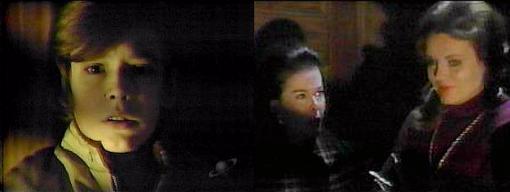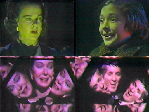 Liz, asleep in bed, dreams that she is at a carnival. David, laughing, says, step this way into the fun house, come on! Everything seems to be reflected through a prism or kaleidoscope. Why did you bring me here? Liz asks him. To have fun like everyone else, David says, laughing. We see a batch of laughing, creepy-looking dolls. Did you and my father ever came to places like this when you were young? asks David. I don't remember, she replies, looking sad, her face reflected in kaleidoscope. You should remember, he says. I can't, insists Liz. Well, that isn't important, he says, but that you're here, now. A doll turns its head, laughing; discordant carnival music fills the air. What am I supposed to do here? she asks. Look at yourself in the mirrors, advises, and laughs. Will they show me all the people I could have been? Asks Liz. No, he says, they'll show you all the people you really are! No, says Liz, I don't want to look at them. You have to, he says, that's why I brought you here--relax, you don't relax enough, laugh enough--and he laughs. We see the doll. Go on and look, he urges. She does, staring into the fun house mirror (where we also see the reflection of an ABC camera). David laughs in the background. Liz stares at herself, then screams. The dolls turn and stare. Don't you have anything better to do than watch me? asks Liz, irritated. They're only doing what they're supposed to, he says--look at the next one, Aunt Liz, it will make you laugh. She gazes into another mirror. I don't like this one, either, she says. David laughs and says, I know something you will like. Wearing a coat with padding under it, making him look fat, he recites: Fat and Skinny had a race, all around the steeplechase, Fat fell down and broke his face, Skinny said I won the race."