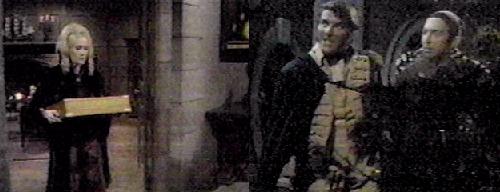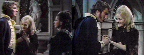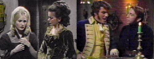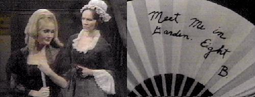 Nevertheless, Millicent opens the fan and uses it--and there is a note that says, "Meet me in the garden. Eight. B." She thinks her cousin Barnabas has finally indicated that he will defend her honor and is very pleased. She brings down the case with the pistols and holds one in her hand. She'll leave the masculine details of the duel to Barnabas, but she'll be there, wearing a new black dress. . .the Countess comes in and is unnerved to see Millicent with the gun. The blonde tells the Countess she heard from Barnabas in England, he said to tell Natalie he loves it, just as she said he would. This is too much for Natalie, who reveals to Millicent that Barnabas is dead. When the latter denies it, the Countess says she saw his body, saw his coffin carried out! Millicent insists she has seen him in the last few weeks and wonders why everyone is keeping him from her--she doesn't know what day it is and has nothing to look forward to. When she tells Natalie she got a note, today, from Barnabas, and finally relents and shows it to her, Natalie sees the note was written on Josette's fan and warns her NOT to meet whoever sent it, if for no other reason than propriety--she can't go out alone to meet a man, even her cousin--Barnabas must come to HER! Oh, that's right, says Millicent, hoping the Countess hasn't lost all respect for her, and Natalie assures her she hasn't if she doesn't meet the sender of the note--and she really should put those pistols away, too. Natalie asks Millicent to let her know if Barnabas does come to her, and Millicent is thrilled to have the Countess for her confidant. (Natalie feels Millicent is more than a little loopy.)