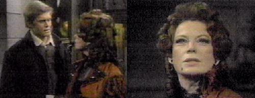 NOTES: We already know that even if Millicent insists, Joshua and Naomi will not allow them to marry, so where is this relationship going to go? I have to give the blackhearted Forbes credit--without using the black arts, as Angelique did, he managed to manipulate Millicent into admitting her love for him--and she was ready to have him shot to preserve her honor! Of course, her gray matter isn't firing on all cylinders at this point, but it isn't her brain Nathan loves, just her money--and now that he's wormed his way back into her heart, he's going to continue the journey into her pocketbook.