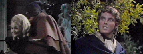 At his lodgings, as he packs for his "departure," Nathan brags to Noah how well it went; his plans are going perfectly! Noah, who fears the girl saw his face and will identify him, just wants his money and to get out of town, but Nathan says he must wait until his plan comes to fruition, then there will be plenty of bucks for both of them?right now, he's broke. Nathan confidently insists Millicent is coming to see him, and very soon, and wants Gifford to get out, but Noah doesn't want to let Nathan out of his sight and insists on staying. It takes quite a while, and you can see Nathan getting nervous. Hearing a knock at the door, Forbes hustles Noah out another exit, hides Barnabas' cane under his bed and opens his door to find Millicent there--again, propriety be damned! He tells her he's delighted to see her, although it's going to be painful saying farewell yet again. She wants to know if he HAS to leave, calling him a brave and noble man. Perhaps she misjudged him, murmurs Millicent. He admits he deceived her and she had every right to be hurt and angry; and he feels leaving would be the best thing for both of them. He meant it when he said he was sorry, and that he will always love her. Millicent gazes at him, her heart showing on her radiant face. She can't face never seeing him again! "Please stay here in Collinsport!" she begs Nathan, falling into his arms. Embracing her, he grins over her head, smiling a winner's smile.