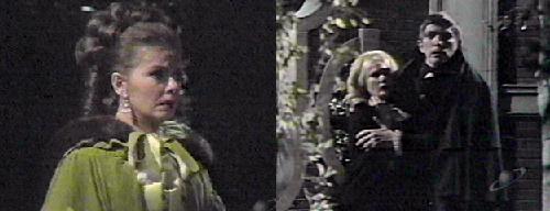 Naomi sits in the drawing room, thinking, then looks out the window. It's dark, she observes. She doesn't want to go up there'it can't be true! Barnabas paces the tower room, looking unhappy. He'll go mad if he stays there--he must go somewhere, find someone, no matter what the consequences!. . .no, he can call on Millicent! He calls her, tells her he must see her. Come to me, he says seductively. She walks downstairs, pausing, then stares at Barnabas? portrait. Naomi hears her talking to it, "Yes, Cousin Barnabas, I will meet you. I will go wherever you ask me to go."  Naomi asks Millicent what she's doing. Who was she talking to? No one--herself, replies the blonde. "I am going out for a walk, I must go out, I want to." That isn't like you, comments Naomi--you don't like the night air. Millicent leaves. Naomi is disturbed. She starts to go upstairs, then grabs her cloak instead. Millicent walks through the woods, finding her way to the gazebo, where Barnabas awaits her. She stares up at him and he takes her into his arms.