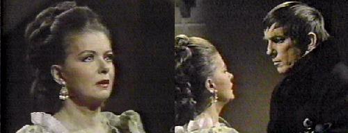 Naomi empties the packet she retrieved from her bodice into the drink she's prepared, takes it in both hands, and drinks, all of it, in one swallow. She sets it down on the desk, opens the drawer, and leaves the note for Joshua propped up on top. Then, slowly, she walks away. Naomi glides to the tower room, unlocks the door and walks in. The door closes and Barnabas is standing behind it. "Mother," he says softly-- "You shouldn't have come here." I had to see you one more time, she says, and begs him to look at her. Didn't you see enough of me tonight? he asks--you saw what I am, isn't that enough? You're still my son, she says, and to find him alive. . . Didn't you see what was happening outside? he asks, unable to meet her eyes. I saw, but didn't understand, his mother says--I still don't--I know it wasn't by choice--tell me why this has happened. He begs her not to make him look at her and tell her--he can't bear the thought of hurting her anymore. "Barnabas, please," she says. "I brought you into the world. I watched you grow to manhood. I suffered the agony of watching you die, and by some strange miracle, you're still alive, not as you were, but whatever has changed you, made you suffer, and feel a deep shame--and I can't leave you until I know what it is."