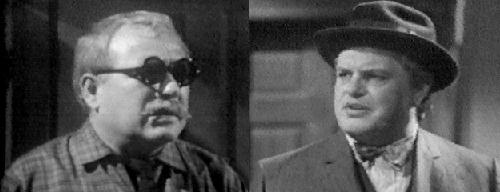 509 - (black and white - we haven't had any of these in a long time) - Sam asks who it is, he knows someone is there, he can feel him breathing! Adam backs away, realizing something is wrong with this man. "Say something!" demands Sam. Adam backs off, holding the knife, then drops it on the floor. Sam hears it fall and tells Adam he can't see. "See?" asks Adam. Sam asks who is he, and Adam responds, "Adam." Sam asks what he's doing there. Sam touches him and realizes he's hurt. What are you running away from, what have you done wrong? asks Sam. "Hurt!" cries Adam. Sam says he'll fix his arm, and realizes this huge man is afraid. He helps Adam to the sofa and asks what his last name is. He decides Adam can't understand English, and says it's nice to take care of someone else for a change. Sam goes into another room, and Adam painfully bends to retrieve the dropped knife. Sam brings out a bowl of water and asks where Adam went. "Here," says Adam. "Come here," says Sam. "Give me your arm." Adam trustingly extends his arm to Sam who warns him it's going to hurt. He washes Adam's arm with the rag, talking about germs. Adam moans with pain, and Sam talks to him as if he's a little child. There's a knock at the door, and this upsets Adam. Sam notes this and tells him to stay there. Sam goes to answer the door and Adam limps away. It's Stokes, who says he wanted to add a footnote to their meeting this evening. Stokes spots the bloody mess that is Adam and, surprised, says, "Mr. Evans." "That is Adam, last name unknown," explains Stokes. Adam stands there, clutching his wounded body, as Sam introduces Adam to Stokes, who notes that he's been in an accident. Stokes tells Sam he was trying to fix him up, but Stokes notices the knife on the floor and picks it up. Stokes asks what's happening here. Adam seems ready to flee, and does so, with Sam calling for him to come back.