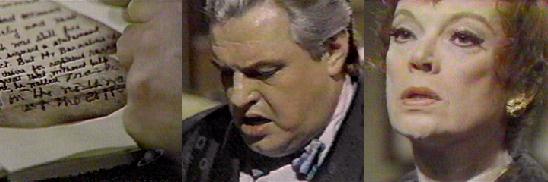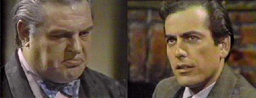 Tony is Stokes' visitor; calling himself Mr. Haley, he thanks Stokes for seeing him so late. Tony Cassandra's "key" in his hand--he heard Stokes was the only one in the city who would know about the cross--he and his wife just bought a house from the 1720's, and when he was tearing up the floorboards, he found this cross. He hands it to Stokes, who wonders how Mr. Haley found out about him. His neighbor, Mrs. Bland (ancestor of the Bland who married Barn and Ang?), knows you, says Tony. Stokes recognizes the artifact as a gold Coptic cross. Tony says his wife got all excited about the piece. Stokes tells him the writing on it means nothing. Tony paces the room nervously, and Stokes asks if something is wrong. No, replies Tony, I feel bad bothering you like this. Stokes offers him a sherry, and Tony accepts. Stokes says the cross is probably not authentic and he'll need it for a few days to test it. Tony agrees. It's used for protection against witches, says Stokes. Stokes pours the sherry, and Tony surreptitiously takes out the ring containing the poison. Stokes says he's going to get some cheese, which helps him sleep, and excuses himself to get it. Tony says he'd like some, too, and after Stokes leaves the room, empties the powder in the ring into Stokes' glass. When Stokes returns, he finds Tony examining the cross, saying he's fascinated by it--his wife thinks it's real gold. Tony's back is to the professor while he's talking to him, and Stokes urges him to come drink his sherry.