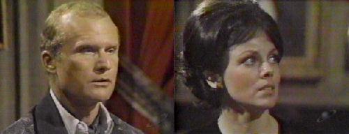 Roger and Casssandra are playing chess in Collinwood's drawing room, but she is clearly not into the game. He notes her poor concentration, and the fact that she couldn't concentrate last night or the night before that. Perhaps it isn't her game, suggests Cassandra, and Roger, miffed, asks her just WHAT her game is. To make him a loving, perfect wife, even if it doesn't include chess, she answers. Do they do that, asks Roger. Only he can tell her, she says, but he complains he doesn't see enough of her. He wraps a hand around her arm and reminds her they haven't even had their honeymoon-let's pack our bags and fly out tomorrow, he urges (I bet they haven't yet consummated, at least not for real). No, says Cassandra, walking away from him. Roger wants them to be alone, and while she says that would be marvelous, he seems to doubt she means that. When they're alone, they fight, she retorts. He sometimes feels she is just here filling time with him, there's something else important in her life happening somewhere else (go with that, Rog!) She denies this, and suggests he go to bed. Roger won't go, he hasn't finished his brandy. Take it up to bed, she says, since he'll only have another when he gets there, anyway. Roger drains his glass and asks if she's coming up. Not quite yet, she says, and he silently, angrily heads upstairs alone.