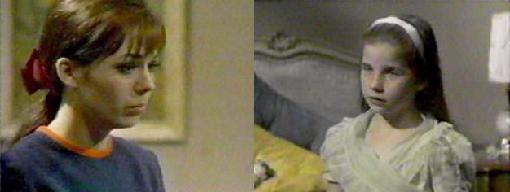 Maggie is reading a book in her room when Sarah appears at the French doors (why are they so open, anyway?) Maggie is a trifle puzzled at the child's familiarity with her, as when Sarah calls her "my very best friend." It's clear that Maggie has forgotten Sarah, too, but Maggie agrees to play catch, and they have a rousing chorus of "London Bridge" as they toss it back and forth. It's soon obvious to Sarah, however, that Maggie doesn't remember her,
