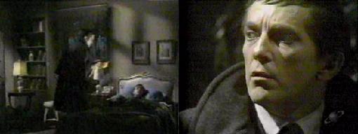 when he hears Sarah's voice singing "London Bridge." He drops the pillow, backing away from Maggie's bed, hoarsely whispering, "Sarah, what do you want from me?" Slowly, fear, sorrow and puzzlement on his face, he retreats out into the night and flees.