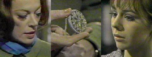 (Maggie's even remembered a coffin!), Julia knocks at the door. She pretends she's there to see Sam, but when she overhears Maggie closing in on a memory of Barnabas, she intervenes immediately and shows the girls her pretty medallion. Julia requests a cup of tea and Vicki volunteers to fix it, leaving Maggie alone with Julia, who proceeds to hypnotize Maggie,
