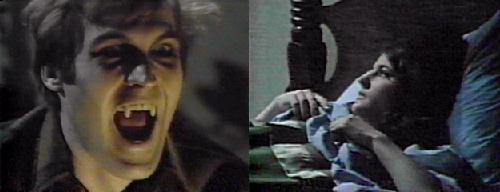 Vicki turns off her light and settles down for sleep. A dog howls. Her curtains billow, then part as Tom enters her room through the window. He approaches the bed, fangs bared, and Vicki awakens and screams. (Not much tongue movement in this recreation of this scene.)