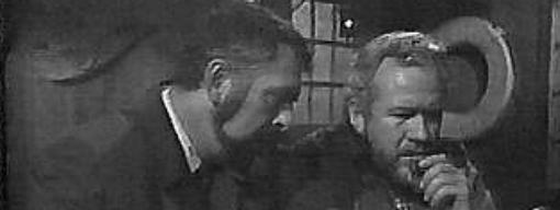 Look, why don't you let me take you home? Joe asks Bill. Bless your heart, says Bill, I don't need to be taken anywhere--you're thinkin' this is gettin' the better of me, eh? I didn't say that, Joe assures him. You're thinkin' Bill Malloy is takin' the secret drink and you've discovered his vice, says Bill. Of course not, says Joe, but Bill plows on--like Sam Evans, only I must say Sam makes no secret of it, only a secret of WHY. Mr. Evans has been drinking as long as I can remember, says Joe. You're memory doesn't go back very far--no reflection on you, says Bill, it just means that you're too young to remember when Sam Evans was as happy a man you could find in the township of Collinsport. I guess he has his pride, remarks Joe--a man can have problems when he's young, too. Ye-ah, says Bill--I thought I had problems, 20 years ago, and I thought I licked 'em, but I didn't boy, all I did was dig a hole and try to bury 'em--like the great lady who's living in that house on Widows' Hill. Mrs. Stoddard? asks Joe--my problems are tied up with Collinwood, too. Carolyn? asks Bill--she's your girl, isn't she? Oh, yeah--that doesn't mean I'm her guy, says Joe. There's not another man in town she's ever looked at, says Bill. Not until recently, says Joe--not until Burke Devlin came back. Bill sips his drink and says he wouldn't dare fool with Carolyn. I have a hunch she's with him in Bangor right now, says Joe. Bill looks at him, astounded--Carolyn?--with Burke Devlin?--it doesn't make any sense. None of it makes any sense, says Joe morosely, if you don't mind, I think I will have that drink. Bill waves the bartender over, and he fills up a glass with beer.