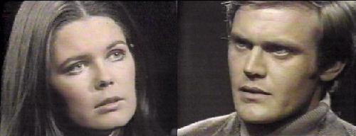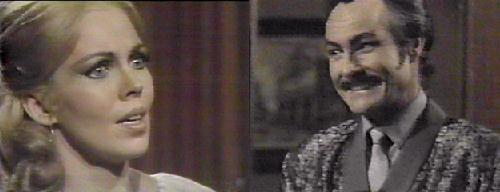 Ang calls to Jeff, waking him up (he's in the infamous brass bed that will appear in later storyline). Jeff is not happy to see her and orders her out. You always fights me, she complains. He turns away--I'd hoped you'd forget me, I can't help you anymore--Barnabas won't let me near the lab. You can, she insists, as long as the equipment is there. He doesn't want to listen to her. She caresses his face, and he keeps saying no. I want to see Vicki, he whines. You need me, she reminds him--haven't you missed me? He looks at her, not saying anything, wanting her despite himself. She knows he needs her. He smiles and says he dreamed about her. (wet?) What is the power she has over him?