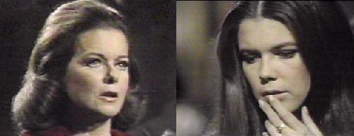 Vicki looks lovely in black with her hair down (perhaps it's that pregnancy motherhood glow). Vicki refuses to make the promises because Liz isn't going to die. Liz is upset. Vicki realizes she can't help what she's thinking, but physically, Liz is fine, and the reports from Windcliff say she's in excellent shape. They won't admit how powerful the mind can be, says Liz, how it can defeat the body. Stop yourself from thinking of these things, asks Vicki. Liz says it isn't that simple. There are doctors who can help her, says Vicki. I've seen them, says Liz. Vicki tells her that if this were happening to anyone else, she'd be the first person to advise them to get help. I can't be helped, says Liz. Vicki insists Liz can't state they understand each other and claim THAT--you and your family have been kind to me, and when I was in the orphanage, I feared I'd always be lonely--I couldn't prevent myself from thinking it, just the way you think she can't do anything--but you showed me I was wrong--let all of us show you you're wrong--help yourself. I've tried, says Liz, I don't like being this way--I have to be, she says, gazing at her model tomb--I'll build it by the sea, on the cliff, and when the bell rings, you can hear it--someone must always be at Collinwood, in case the bell does ring, because if it does, it will mean I'm alive.