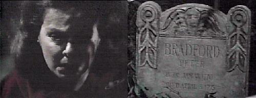 "No," cries Liz, "I'm all right." The ugly voice tells her it's starting, soon she'll be lying there and whoever finds her will think her dead! Jeff comes to her then. She tells him not to come near her--he's dead--Vicki told her he's dead. He grabs her shoulder as Liz orders him not to touch her, and she falls over, giving him a good look at Bradford's tombstone--born 1/18/1770 died 4/3/1795.