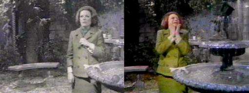 Barnabas shows up at the terrace at Collinwood just in time to hear Burke and Vicki arguing about Liz' offer to let them live at Collinwood. Angry and dismissive, Burke leaves her standing there and goes inside to use the phone. It's Julia's turn to eavesdrop on Barnabas and Vicki as the vampire lends a sympathetic ear to her troubles.