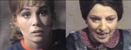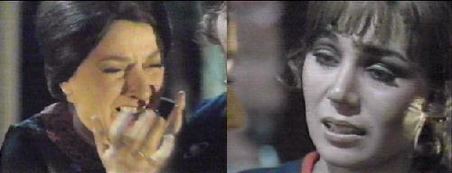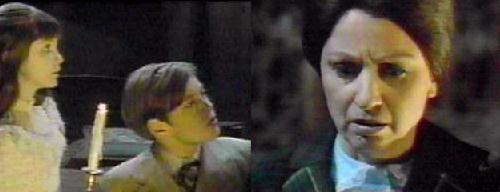 Harry comes downstairs and announces to the absent Maggie the kids aren't on the second floor. He's annoyed--now she's gone! Maggie and Mrs. Johnson come in with Amy and David, Mrs. J still gasping and frightened. Harry asks what's wrong. His mother orders him not to speak to her--I told you not to linger, and if it were left up to you, I'd be dead by now! She sits down under Barnabas' portrait, the others clustered around her. Harry asks what happened. She just had a bad scare, says Maggie. Mrs. J tells her son to make himself useful--I need water. He leaves to get some. Maggie sends the kids into the kitchen with Harry. The children assure Mrs. J she's safe at Collinwood. Left alone with Maggie, the housekeeper insists the children have something to do with this. Maggie is shocked. I'm not crazy, says Mrs. Johnson--something terrifying is going on with the kids. Maggie is angry, but Mrs. J says the man in the cottage was dressed funny, old-fashioned, like Amy and David were when she caught them playing dress-up.