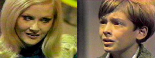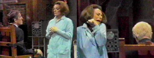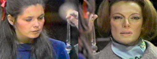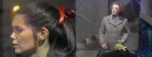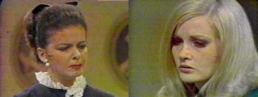 "You will never forget and never remember" this incident, intones Julia. Julia leads Vicki back to Collinwood and awakens her. Carolyn, forced to make the coffee herself because Mrs. Johnson was sick, comes in at that moment with a tray laden with coffee cups. She tells them to enjoy the coffee themselves, she has to help her mother. (That coffee must have taken a looooong time to allow Julia her trip to and from the Old House.) Vicki asks Julia if she can look at the crystal again, and starts to mention that she wants to show it to Barnabas-but the name seems to make her uncomfortable. "If the crystal will make Barnabas happy, by all means," says Julia, smiling smugly.
