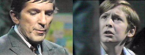 David turns and says, "You're always accusing me!" You put yourself in a position where I have to, points out Barn. I didn't want him to die, says David. Both adults say they know that. Then why are you accusing me? demands David, near tears--I wish I'd never opened the door, I wish I'd gone to Portland to get my father, then you wouldn't think I had anything to do with it! David stands, his voice rising; he shouts, physically struggling with Barnabas, "WELL I DIDN'T, YOU HEAR ME, I DIDN'T!" Barnabas tries to calm the boy down, gently holding his arms, and this is the tableau Roger walks in on. David races to his father. "He thinks I took the book!" blubbers the boy. "He thinks I had something to do with it!" Sobbing, he rushes into his father's embrace. (An amazing performance by Henesy; he is so very good here.) "Father, he hates me. . .he hates me," sobs David. Roger looks sternly at his cousin and asks what all this means. Barnabas looks like he couldn't possibly explain it.