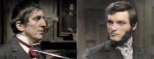 Quentin nods and hands back the jewelry case. Judith agrees to let Barnabas come up, and Quentin objects--isn't Edith too ill for company? Judith says who knows, perhaps the sight of a gentleman might do her some good. Barnabas hides a smile on this as he follows Judith upstairs and Quentin looks with hatred at the portrait of Barnabas on the foyer wall. A carriage pulls up. Quentin opens the door and comes out. He quickly closes the doors behind him and goes into the drawing room, closing those doors as well. He takes a drink and swallows most of it down. Rachel and Edward enter the house, and she looks around as if she REALLY likes this place, smiling. Edward looks for someone, but the servants are all hiding, he says sourly. Quentin comes in, grinning. "I am your servant, Edward," he says, bowing. "Your wish is my command." Edward looks like he was just slapped with a rotten fish. Quentin spots Rachel and, looking her over in a most ungentlemanly like manner, starts guessing who she is: Edward's new wife? No, too pretty. Ah, the new governess. Much too pretty, he says. She isn't your mistress? asks Quentin. Edward, furious, demands what he's doing back in the house. It's about time he said something, says Quentin--he is living here. How do you like that? Edward's face tells all--he hates it!