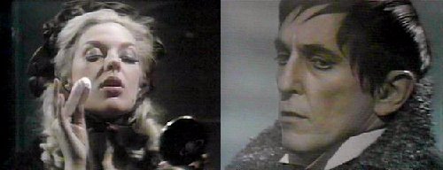 Docks - We hear the sounds of the sea, of ships, foghorns. There is fog. Barnabas finds something on the ground. A lady calls to her gentleman friend that she lost her compact, and that's what Barnabas has found. She calls to her drunken friend, Charlie to sleep off his drunk, complaining he's spoiled her evening. A blonde woman appears, searching for her compact. He apologizes for startling her, but she assures him being startled is the most interesting thing that's happened to her all evening. She tells him she lost her compact, which was given to her by Captain Strathmore, a very kind gentleman. He was very considerate, but she doesn't know what became of him. Barnabas hands her the compact and she thanks him, calling him considerate, too, and she's very grateful to him. She needn't be, he assures her. She introduces herself as Sophie Baker and asks for his name, but he thinks it would be better if he didn't reveal his name. She thinks that's an odd thing to say. He's glad she found her compact, but he must go now. She doesn't want him to, and takes his desire to leave as some sort of insult: "What's the matter with me?" she asks, taking his arm. Nothing, he says, you're very lovely. Why is she having such a miserable evening, then, she asks--first Charlie gets drunk, now HE's got cold feet (and hands, and face, and lady, EVERYTHING is pretty cold!) Barnabas apologizes. She says Captain Strathmore wouldn't have treated her like this, he was very considerate. Feeling those damned blood-hunger pangs coming over him, Barnabas bids Sophie goodnight, but she again stops him, saying the least he can do is escort her to the door of the Blue Whale. Would he mind? Not at all, he says, hurrying her along. She can't go like this, she has to adjust her makeup. She pats powder on her face, commenting it's such a nice night, he's alone. . .and she's alone. . .and they could. . .then Sophie notices that even though the strange man is standing behind her, he isn't casting a reflection in her compact mirror.
