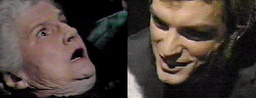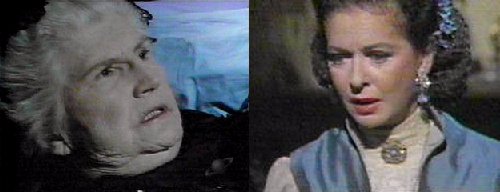 Edith tells Judith she's ready for her gentleman caller. Judith admits Barnabas to the room, apologizing for the darkness, which hurts the old lady's eyes. Barnabas says he understands. Edith asks Judith to open the drapes wider, and she complies. Judith tells Edith she saw a carriage downstairs--it must be Edward. This excites Edith--she must see him! Go get him! Judith hurries out. Well, young man, says Edith, "I hear you brought me a present." She isn't used to such thoughtfulness in this house, not since her hubby died 34 years ago. She hears it's a family heirloom. Yes, says Barnabas, it was Naomi's. He introduces himself to her. She rolls his name off her tongue and asks him to come into the light so she can see him. He does. She gazes at him and her mouth drops open in horror. "Oh, my God!" she cries. "You are the secret, passed down from one generation to the other--you were never to be let out! We have failed! We have failed!" Barnabas tries to shut her up, advancing on her. "Don't come near me! Don't come near me, she warns, holding her face between her hands, covering her throat. "I know what you are! I must send for Edward and warn him. He must take you away again!" Edward knocks at the door as the old lady flails on the bed. "Quickly, quickly!" she cries. Edward races to her side. Barnabas doesn't know what to do. Edward tells Barnabas his sister told him she was all right just a moment ago. He asks Barnabas to leave them, he must be alone with her. "Please Edward!" begs the old lady. Edward holds her hands in his, and she says his name; otherwise, her speech is garbled. "Tell me what the secret is!" he pleads desperately, as Barnabas, equally desperate, stands listening at the door.