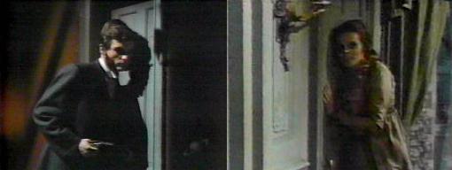 "Oh, God, God, she has a devil in her!" mourns Magda--Sandor, get the cross. Sandor leaves. Oh, Jenny, cries Magda, sister. . . Sister? asks Jenny, her face shaking as she falls into Magda's comforting arms. Magda holds her crying sister and cries, too, patting and soothing her. Jenny mutters some incoherent words. I know, Magda assures her--but why did you run away after he left you? Run away? asks Jenny--oh, yes, she laughs, to my lovely, lovely room, filled with her memories, they put me there so I could remember him. They kept you locked away all this time? asks Magda, shocked and disgusted. Quentin never left me, insists Jenny. We will take care of you, Magda assure her. No, Quentin will, says Jenny--I don't need you. No, says Magda, they won't lock you up again, we will go away together, you, Sandor and me. No, Jenny cries, I must see Quentin. Yes, and then you will leave, and be as you were before, says Magda. You won't let me see Quentin, will you? asks Jenny. Magda assures her, you will, but Jenny doesn't believe her. Magda calls for Sandor. When her back is turned, Jenny hits her over the head with a big book. Magda tumbles to the floor, forcing Grayson Hall to hold her black wig on her head. "You won't let me see him," says Jenny, "you wouldn't!" And she wanders away, leaving Magda unconscious and alone for Sandor to find. He falls to his knees to check on her.