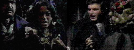 The moon has risen. It's time, Magda tells Sandor. She scoops up dirt from Jenny's grave and says, "Let my voice be carried by the wind, be taken to the surrounding countryside, heard by all the tribal chiefs and prophets. . ..I speak for one of us who has been struck down and for whom we must secure justice. Listen! Hear my words! Honor my wish!" She makes the two-fingered sign and says, "I place this curse upon Quentin Collins, and upon all his male kin of succeeding generations..."