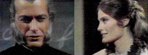 Quentin, carrying his carpetbag and dressed in his cape, descends the stairs and goes into the servants' quarters. It's 7 PM. Beth has packed her belongings in a suitcase, which she closes. She glances through the window.and begins tying a hat on her head. Quentin comes in, joyously holding and pawing her. "You decided to come with me, eh?" he asks. Yes, she says, pulling away from him. You don't sound very enthused, he complains. Beth turns to look at him, then asks, why do you want me to go with you? That's obvious, he says, for a long time--"I love you, Beth." I've been thinking about us since the other night, she says, and if we are going away, you must be honest--you don't want me along because you love me, because I'm not sure you love me--or anyone (wise gal). Quentin doesn't answer, but turns away from her when he denies what she said. You want me with you, says Beth, because you're the kind of person who can't ever be alone or do anything alone--people mean nothing to you, you use them and when you're tired and bored, you discard them in favor of new ones. If that's the way you feel, he asks gently, why have you decided to come with me? I love you, she says, and care about what happens to you--every instinct tells me not to go, but I'm going anyway. He takes her in his arms and assures her, you won't regret it, then plants a big kiss on her. I'll take you back to the carriage, he says. I have something to do, she says, a personal matter in Collinsport. There isn't time, he says desperately--it will be dark soon, we must leave. Beth, however, insists, I must go.