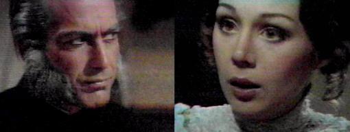 I figured she'd do that, says Trask, to tell them about Jamison. He thanks Dorcas for her excellent report. Dorcas, clearly smitten with the Reverend, tells him, you inspire me (to lust, one would assume, but God knows why). You're a comfort to me, praises Trask, but certain other teachers here (Rachel, I guess), are a trial. Why don't you just get rid of Rachel? Asks Dorcas bitchily. Because Rachel sometimes makes me feel animal instincts, confesses Trask, like anger and ugliness (and unmitigated lust?), so having her around gives me an opportunity to face those feelings and fight them, so I can ultimately overcome my baser self. (pardon me while I hurl!) Therefore, he finishes, I will keep her here until I become as pure as I wanna be. (my paraphrase)