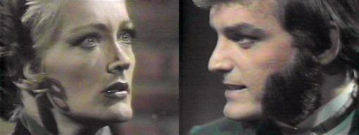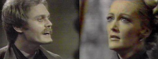 Old House - Beth tells Barnabas, Quentin insisted I meet him at the cottage--he accused me of wanting to kill him, which surprised me--he kept asking questions about why I went into town, and I got so confused, I almost told him about the children.  That would have been a grave mistake, says Barn.  She explains the lie she told Q about the old lady, the cat, and getting bitten.  He saw the marks, realizes Barnabas.  She sobs, everything that could go wrong, went wrong.  Calm down, says Barn.  I can't, she says hysterically, I've been telling one lie on top of another and soon they will all come crashing down on me, I don't know how much more I can take, and there's no one in the world I can turn to. . ."Except me," he assures her, "except me."  (That was hot!)  They are face to face.  "And you have me, to do whatever has to be done," she says, calmed now.  "And now I'll tell you what has to be done," he says.  With Magda and Sandor in Boston, you must guard me.  "I will," she promises.  It will be difficult, but you must do it, he says, handing her a gun--there are winds blowing in all directions, you must be watchful.  She promises that, too.  He goes into the cellar.  Beth sits upright in a chair, gun in hand.
