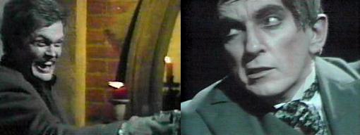 Cottage - Dirk speaks into the fireplace, going on and on about how I took care of Barnabas, what he tried to do to you, tried to hurt you--no more!--does that make you happy, Laura?  The way I told Jamison--I know it did, is that what you wants from me?--give me a sign, one little sign, the crazy man begs.  The door flies open, Dirk thinks it's Laura--is it you, or the wind? he asks.  The lights go out.  Are you here, Laura?  He looks into the fireplace, sure she's happy because of what he did.  Barnabas' laughter fills the room, terrorizing Dirk.  Who's there? he demands.  He orders the laughter to stop.  Barnabas' voice asks him if he's frightened--you do recognize me, right?  Impossible, says Dirk.  No, says Barnabas.  I thought I killed you! says Dirk.  Barnabas asks, how can you kill someone already dead?  "This isn't happening!" yells Dirk, covering his ears.  Face it, taunts Barnabas, you failed--and you know what happens to people who fail.  The door slams closed--"You will never leave this house, Dirk," warns Barnabas.  Dirk struggles with the doorknob, but the vampire appears behind him, grabs him, turns him around.  "You thought you could kill me, didn't you?" asks Barn, as Dirk cowers.  Barnabas advances on the insane man, who keeps insisting, I killed you!  "Was I really dead?" asks Barnabas, turning on a lamp.  YES! screams Dirk, moving away from him--what are you going to do to me? What do you think? asks Barnabas.  Kill me? asks Dirk.  Yes, says Barn, I have no choice--you went where you shouldn't have gone, saw what you shouldn't have seen, and what you know will never be spoken now--what you saw will be reflected in your dead eyes forever, and no one else will ever know that you've been in this house.  Wild-eyed, Dirk reveals, I've already told somebody!  Barnabas grabs him by the collar, furious.  I've already told somebody, repeats Dirk, so even if you kill me, you're going to be destroyed.  You're lying! Barnabas accuses.  I'm not, Dirk says, and Laura will get her revenge--you will learn in time who knows your secret.