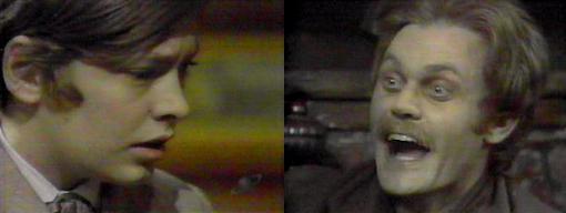 Dirk says, that's long enough to see the flames get bigger, come alive, your mother's way of telling you she's happy--and why?--because, says Dirk, Barnabas Collins is dead.  This shocks Jamison--I just saw him last night.  I can't reveal how Barnabas died, says Dirk, because your mother's enemies would come after me and I wouldn't be able to finish what I have to do.  Jamison refuses to believe him.  Dirk grabs the boy's arm and assures him it's true, Barnabas is dead in the cellar in the coffin at the Old House.  This is all incredible news to Jamison, who asks why Barnabas has a coffin.  Because of what he is, says Dirk insanely, eyes bulging, because of his SECRET!--the secret he hurt Laura with.  Jamison asks Dirk, let me go, you're hurting me.  Dirk shakes Jamison fiercely, demanding he promise not to tell anyone.  Jamison says, I must get back to the house.  Dirk demands the promise, explaining, the reason Barnabas killed your mother is because of this secret.  Jamison doesn't get it--it's the secret Barnabas was going to hurt your mother with--you have to tell them the vampire is gone.  This really scares the kid, who insists Dirk is just trying to frighten him--there's no such thing as vampires!--is there?  Dirk advises him to go to the Old house and see for himself, laughing wildly in his face.  Don't worry, says Dirk, I killed him--the vampire is dead!  He releases Jamison, who races from the house.  Dirk laughs.