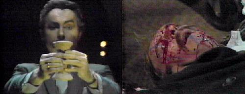 Nicholas dips his fingers into whatever is in the cup and anoints Maggie with "the blood of the owl, the raven and the bat. You will dwell with me forever in the land of the dead," he intones. "You will live, as I live, as one of the damned! Your spirit has united with mine." He drinks from the cup, then kisses Maggie's mouth. He raises his arms and calls out, "Let the legions of the damned salute you!" We hear the souls of the damned screaming in pain. Nicholas lowers his arms.